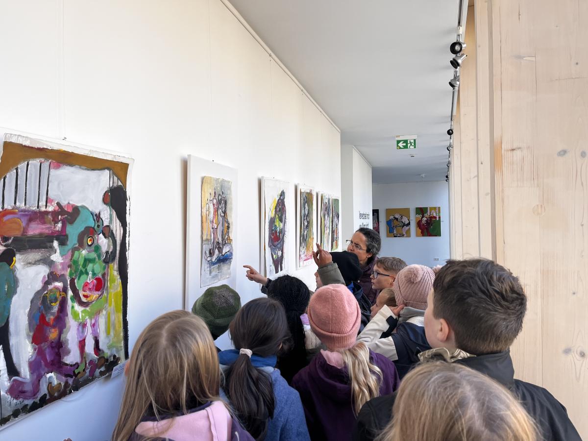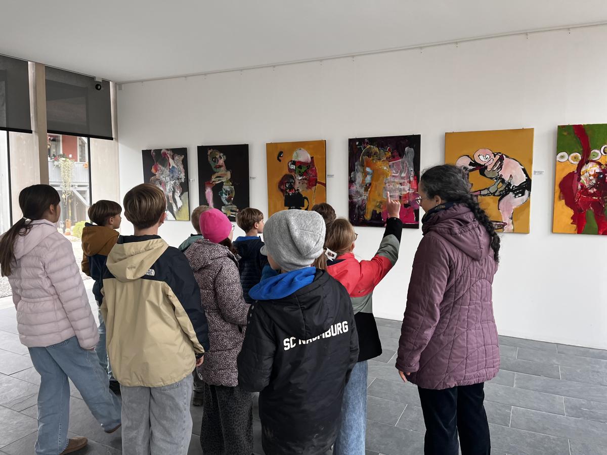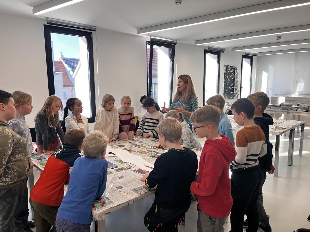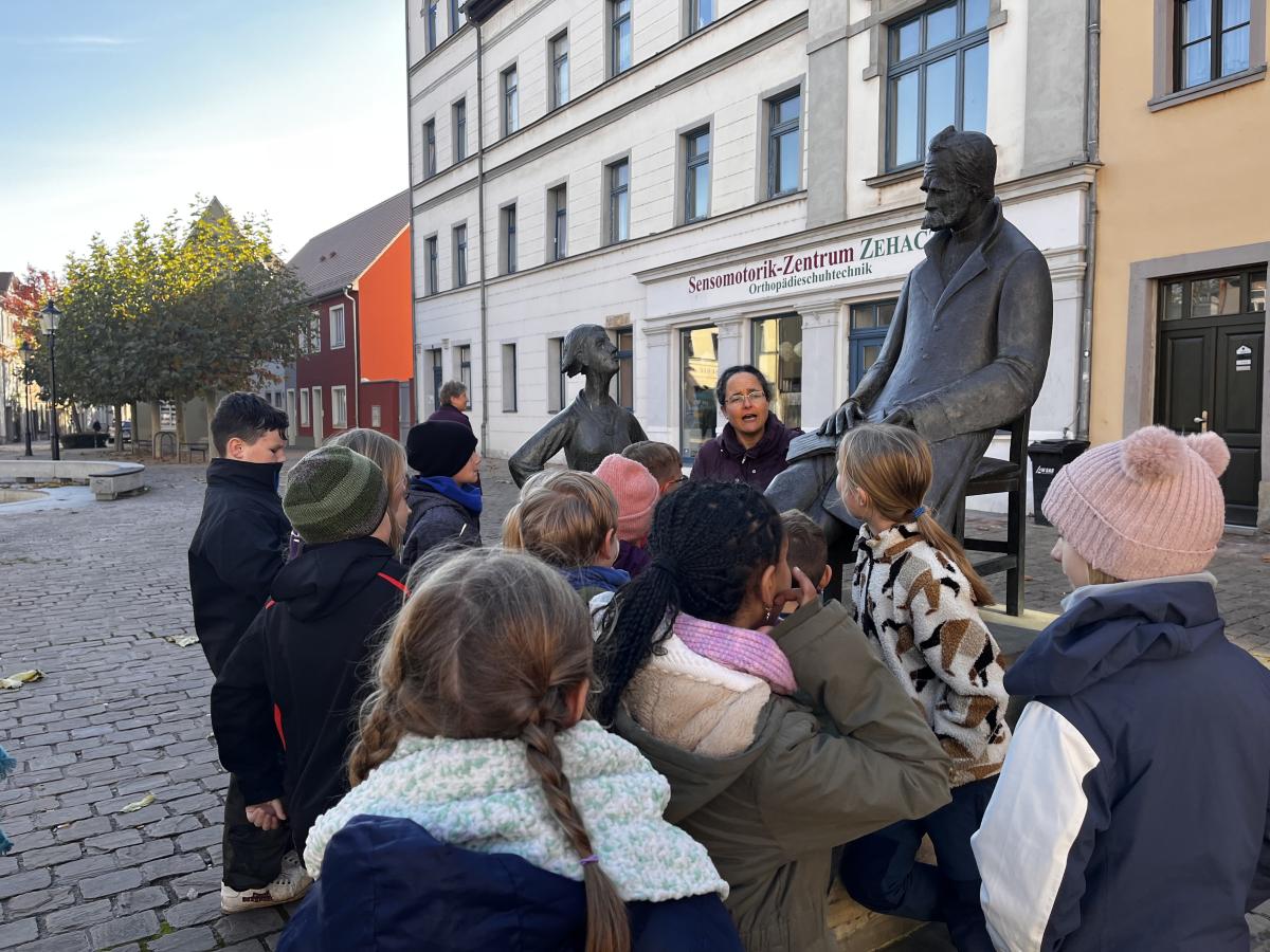 Das Angebot "Kunst trifft Kinder" vereinte Kunst im Stadtraum, mit einer Ausstellung im Nietzsche-Dokumentationszentrum und der eigenen Kreativität. Auf dem Weg dorthin machten sie halt an einem besonderen Denkmal auf dem Holzmarkt - Nietzsche sitzt mit ausgestreckten Beinen auf einem Stuhl und ein Mädchen steht etwas herausfordernd vor ihm. Scheinbar hat er Spaß an einem kleinen Streitgespräch mit der jungen Dame. Ihm Nietzsche-Dokumentationszentrum schauten sich die Kinder die Ausstellung von Conny Gabora "Nietzsche Echo" an und wurden dann selbst tätig. Es entstanden verschiedenen Collagen. Am Samstag, 29.11.2025 um 15 Uhr wird die Ausstellung mit den Kunstwerken der Kinder in einer Vernissage eröffnet. Sie sind dazu herzlich eingeladen.